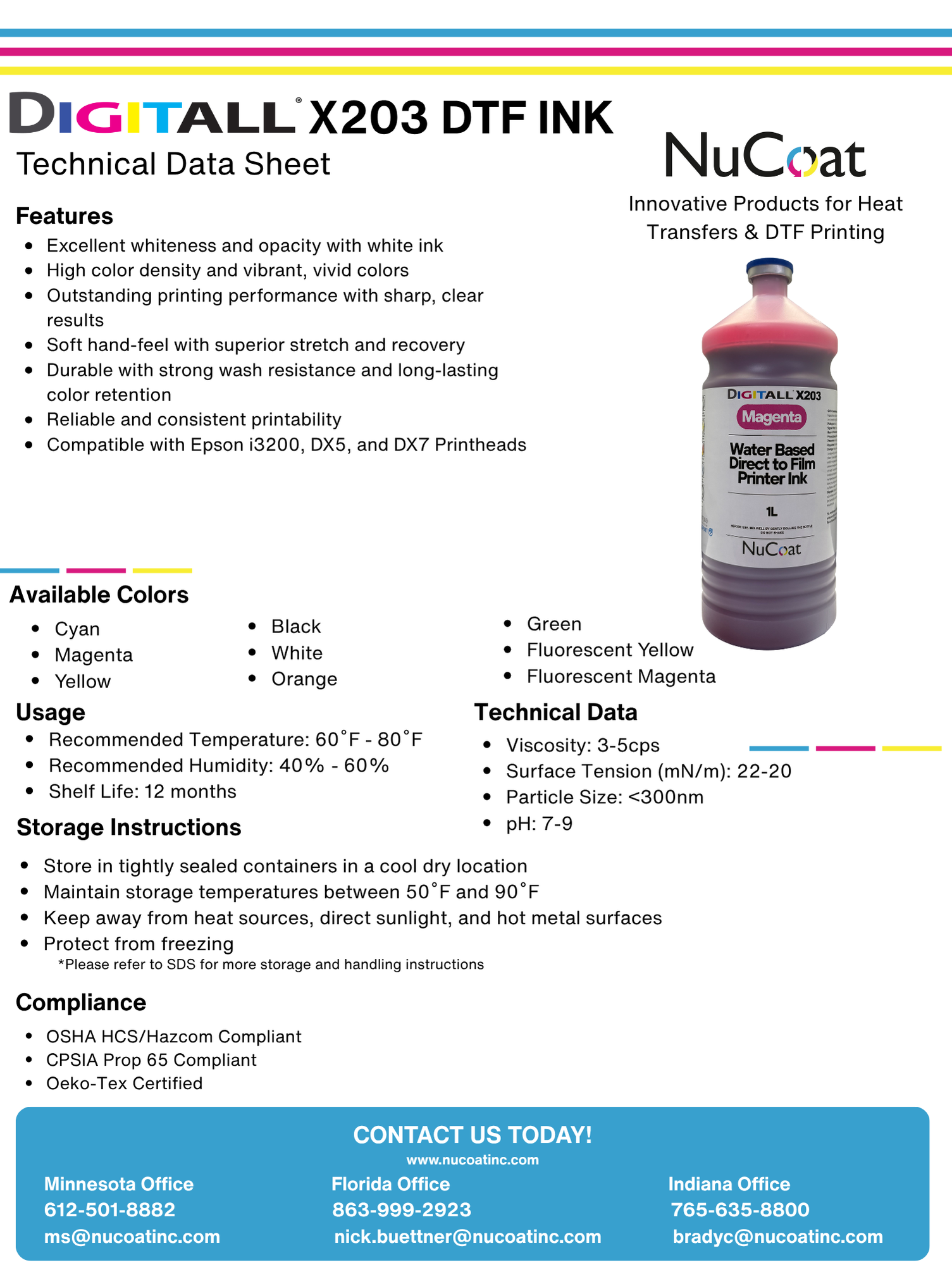 Digitall X203 DTF Ink is built for industrial-scale production, trusted by top decorators and dealers for its vibrancy, reliability, and compliance. Engineered for Epson printheads, it delivers consistent, high-quality results while meeting the industry’s toughest safety standards.